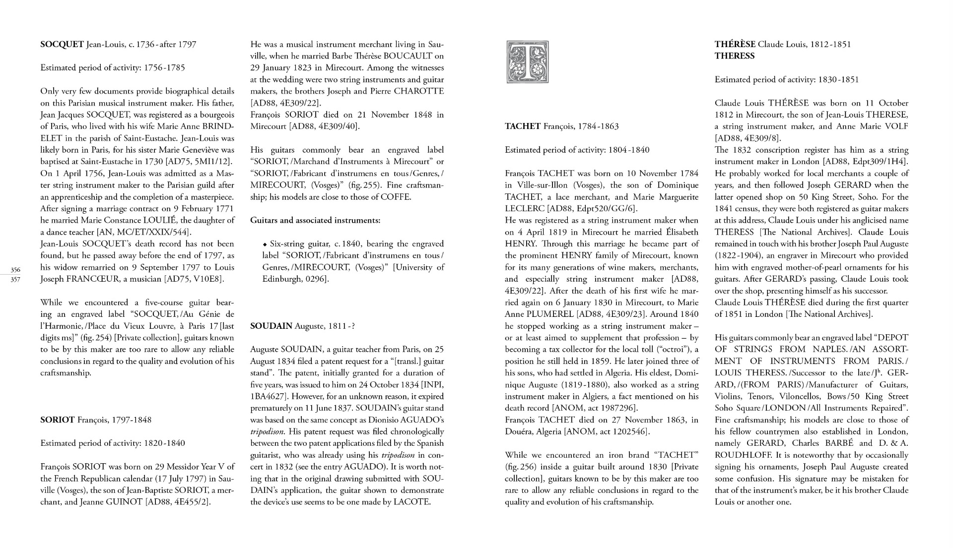 Of course, this role as the epicentre of all guitaristic activity – one that the neologism guitaromanie ultima-tely fails to capture – was often shared: sometimes with an entire nation (the Spanish one), at other times with European metropolises (Naples, Vienna and London). But nowhere else was this much music for the guitar written, published and played, nowhere else were this many pedagogical works for it published, and nowhere else – possibly with the exception of Spain – were this many craftsmen and inventors devoted to it. Often at a loss, occasionally with profit, but always with passion. That is one of the lessons to be drawn from the approximately 300 individual stories of instrument makers, inventors, and specialised merchants gathered in this book.